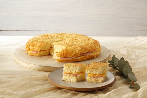 Pão de batata com provolone, recheado com presunto, queijo prato e pasta de requeijão.